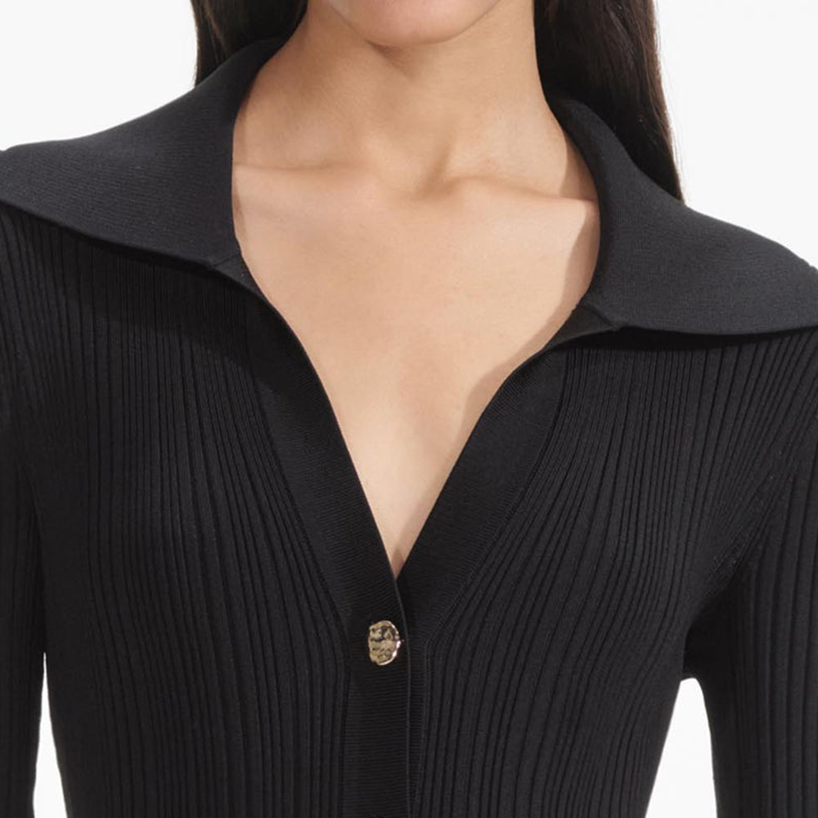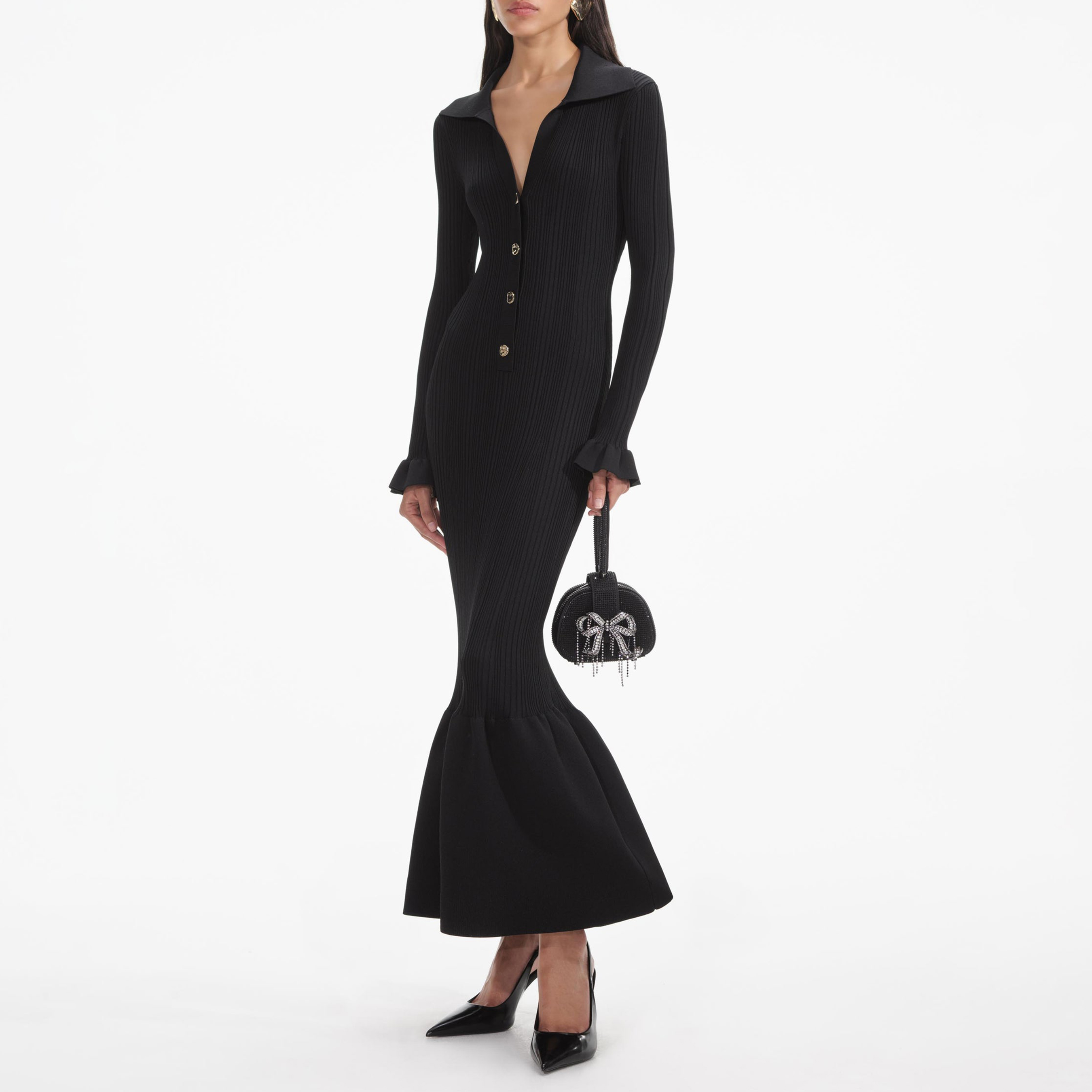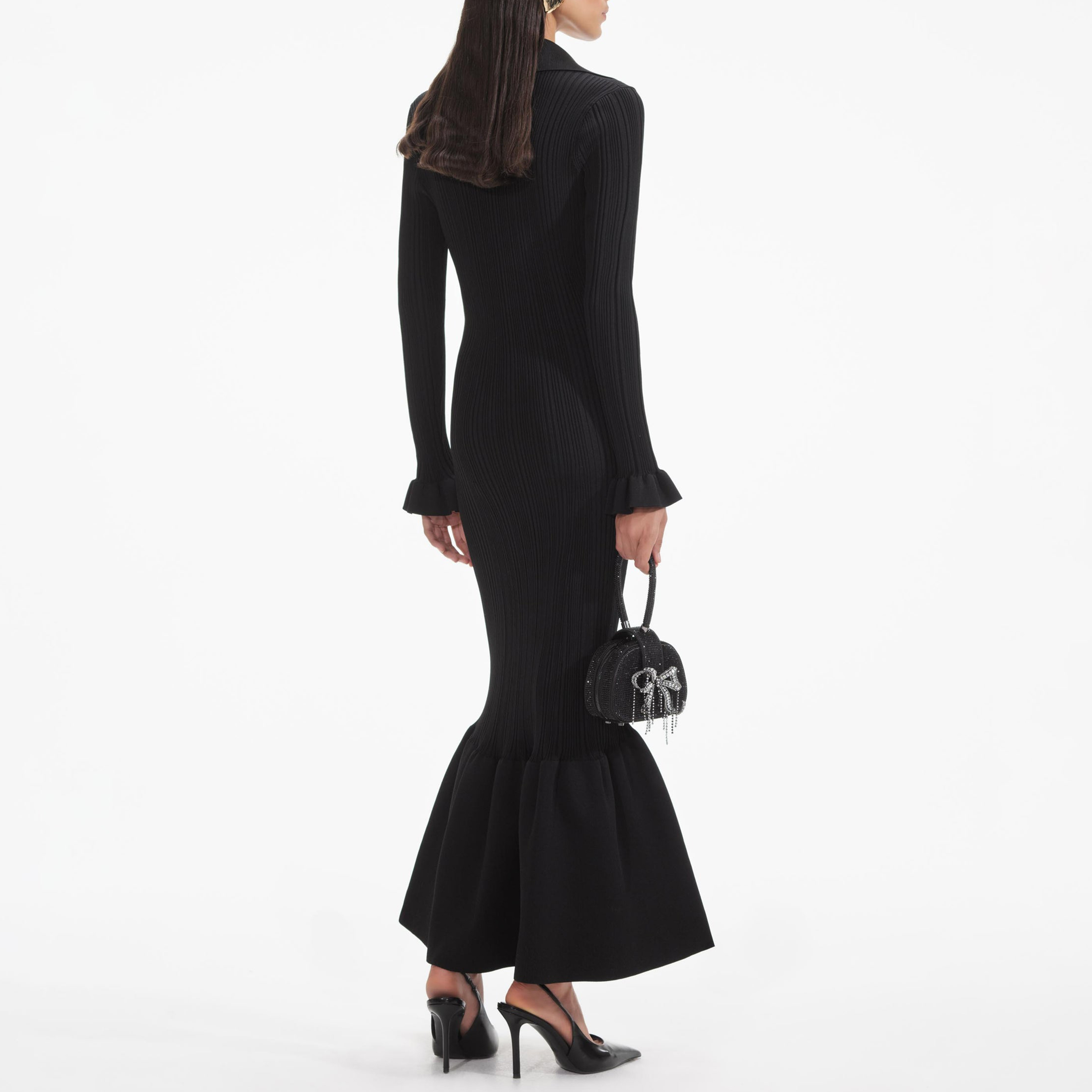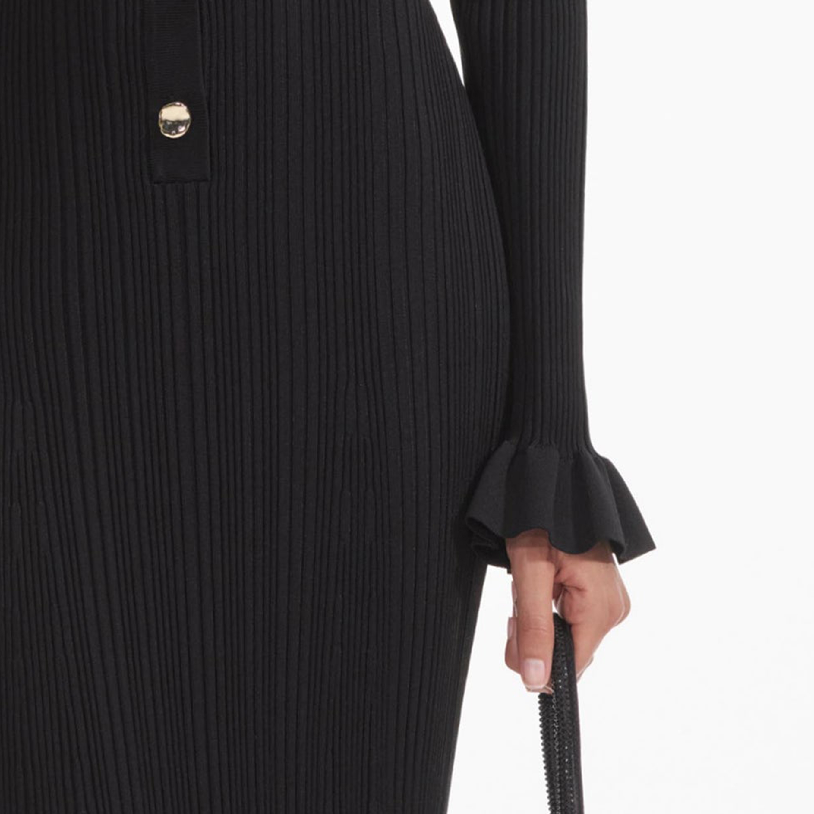Black Ribbed Knit Fluted Midi Dress 854449